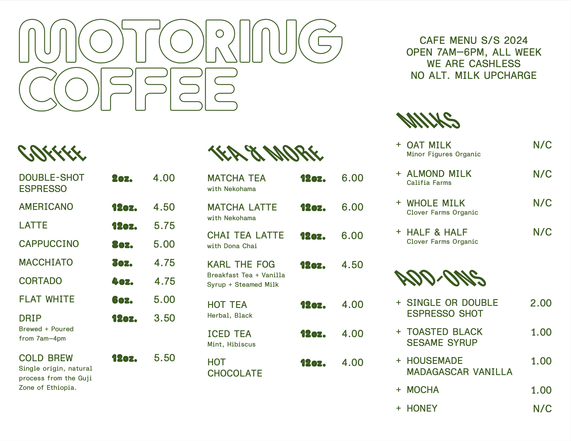 SF is our 2nd location, located on Union St. in Cow Hollow, Motoring Coffee is the public facing coffee shop and retail experience located in an old warehouse that also houses our Membership Club, The Motoring Club. We’ve got the following on tap for our SF customers: